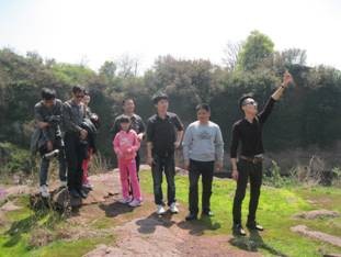 沿著島上的小路,忽然發現這條路一直延伸到兩塊大大的巖石中間,抬頭望去,這不就是一線天嗎?緊連著的是回聲四起的巖石湖,據說湖深莫測。羊腸小道,依山而繞。無意中在山腳下發現了許多蕨菜。這么原生態的綠色食品,誰都不愿錯過。同事們你一根我一根的,享受著采摘的樂趣。在不知不覺中,我們來到了石塔山下,順著石階,我們爬上了山頂。依石塔而立,居高臨下,放眼望去,磯山與鄱陽湖盡收眼底,感覺像是站在北京的高樓看中國,借此喻意,祝我們中寧公司未來的前程,平步青云。