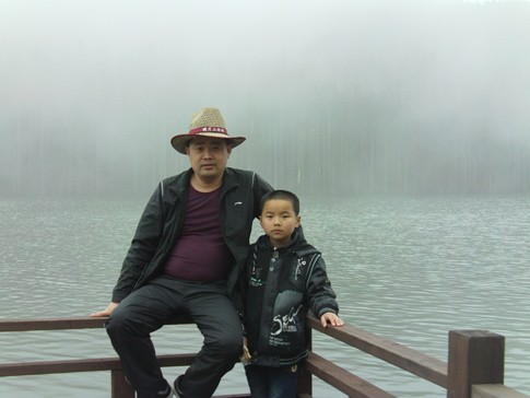 終于,在3個半小時汗水與霧水洗禮的漫長期待里,我們踏上了明月山的山頂。可能,大家都會一直在問,我們的先鋒官呢?在照片的影集里一直沒有看到他的身影,確切的說,應該是他們的。這是后來我才知道的。我本以為我們的先鋒官--蔡文斌是一個人爬上山的,哪知,他還帶上了他沒坐纜車的兒子,在我們往山頂攀爬的時候,他們早已在山頂等候我們多時了。