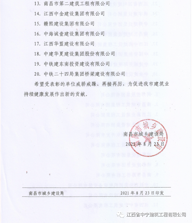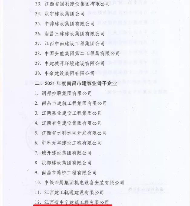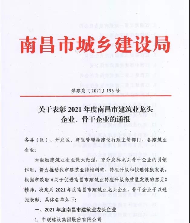 近日,由南昌市城鄉建設局發布的《關于表彰2021年度南昌市建筑業龍頭企業、骨干企業的通報》中,江西省中寧建筑工程有限公司榮獲“2021年度建筑業骨干企業”榮譽稱號。