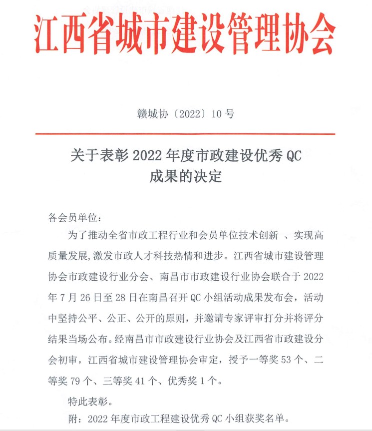 我司榮獲2022年度江西省市政建設優(yōu)秀QC 成果一、二等獎