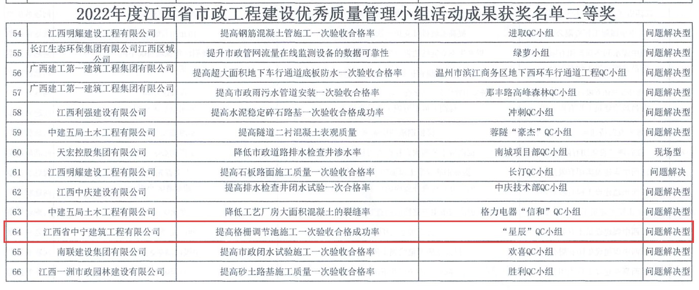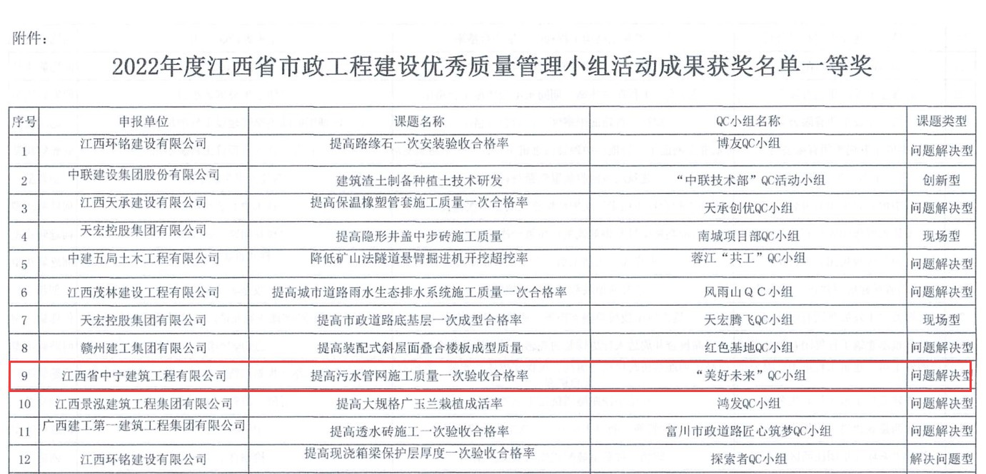 2022年7月26日至28日,江西省城市建設管理協會市政建設行業(yè)分會、南昌市市政建設行業(yè)協會在南昌召開QC小組活動成果發(fā)布會,江西省中寧建筑工程有限公司榮獲一等獎1個(排序9),二等獎1個(排序64)。