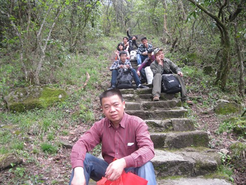 往上走的小徑越來越陡峭,在下山的人口中得知,索道中站就在前方不遠的地方,心中暗喜:實在走不動,就坐纜車上去。15分鐘,我們順利的達到了索道中站,大家爭相拍照留念。現在想想,唯獨,一心只想著休息的我,沒有在此處拍一張照片做紀念。現在看著他們婀娜、多姿的pose,讓人羨慕。旁邊的袁工在我前方喊著:“戴工,前面是一片平地,你手上的小竹桿可以扔掉了。”其實,我早就想扔了,借袁工的話,我順勢放棄了與小竹桿握手的機會。休息的時候,我也在想,這么累,胡董肯定會說我們坐纜車上去的。然而,事非這般。胡董休息了一會兒喊著:“前面不遠的地方,就是山頂了,我們繼續徒步前進,如果累了,我們每算200步就休息一下,先小目標,再大目標。”